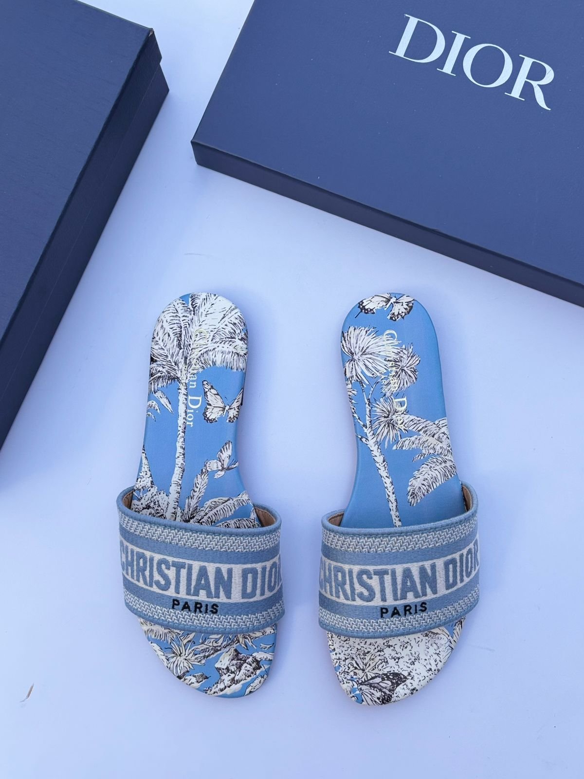 Christian Dior Men’s Blue Printed Logo Slippers – Designer Summer Open Slides
