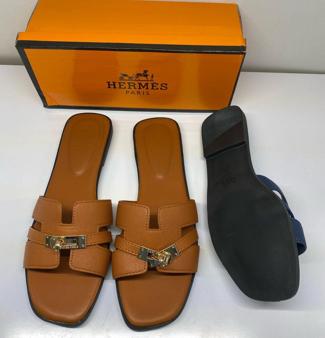 HermΓ¨s Tan Flat Slides with Signature H-Buckle β Premium Leather Comfort
