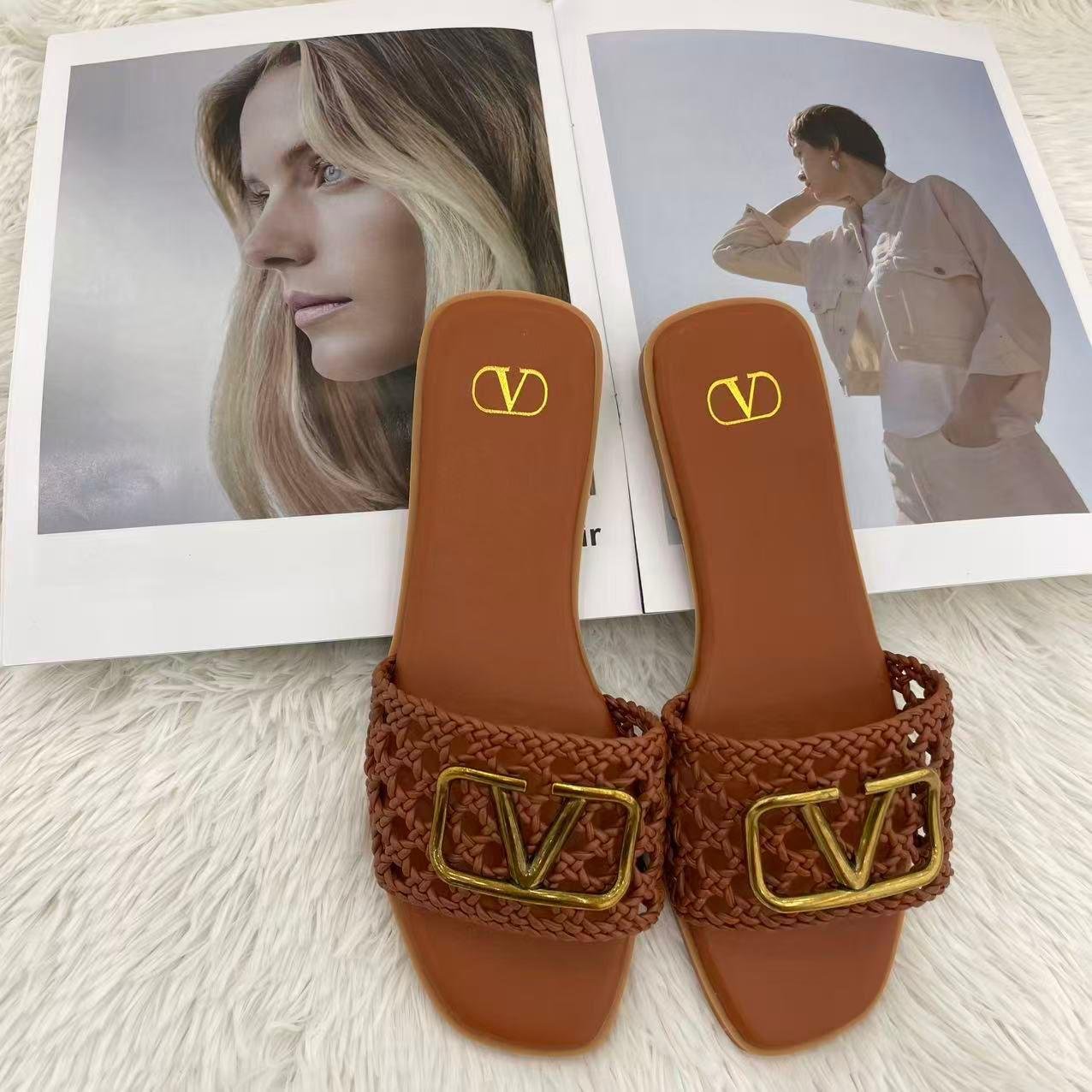 Valentino Slide Sandals Brown Crochet with Gold V Logo – Valentino Garavani