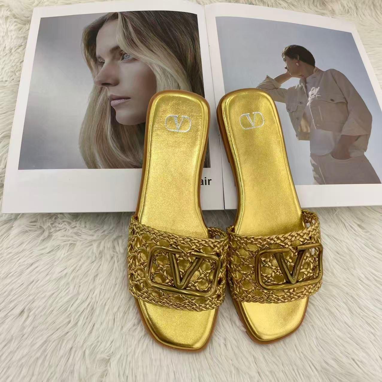 Valentino Slide Sandals Golden Embroidered with Gold V Logo – Valentino Garavani